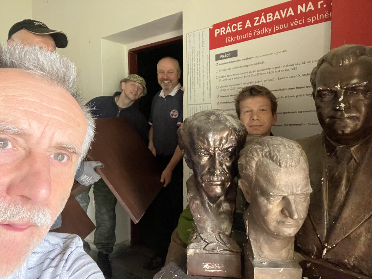 Kahancový badatel Ihák nás pozval na Den dětí na nádraží ve Zlatých Horách, kde uspořádal dětsky hravou brigádu. Cílem bylo vyklidit a trošku i uklidit dvě místnosti, které v dávno opuštěné nádražní budově obsahovaly hojnou zásobárnu pro naše dětinské radovánky. Proto jsme se zúčastnili v nečekaně hojném počtu, jak ukazuje i fotografie. Je na ní Klement Veliký i Kléma malý, Tonda Uražený s uraženými brýlemi a dokonce i drobnější Edvard Beneš se skrývá za těmito revolucionáři. Vynášeli jsme olejničky, kolejničky, dlaždičky, části výhybek, dlouhé trámy, krátká prkna, či nádražní váhy.