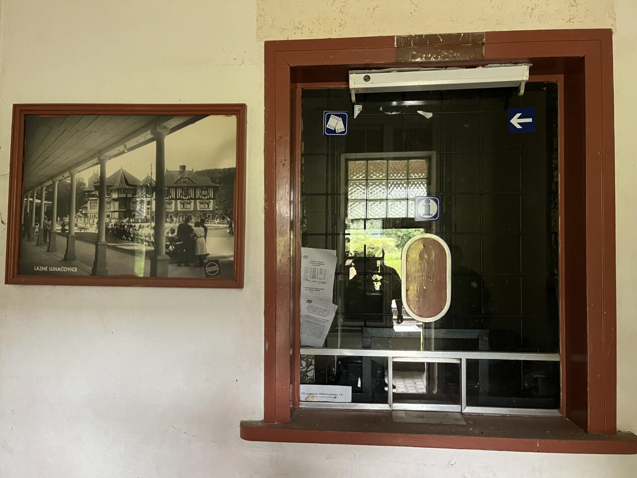 Konečně jsme také mohli odhalit dávno nefunkční přepážku výdeje jízdenek, která stále zve na luhačovickou kolonádu, která ovšem už nestojí od r. 1947, kdy byla zbourána a v r. 1952 se na jejím místě zjevila kolonáda, jakou můžete vidět dodnes.