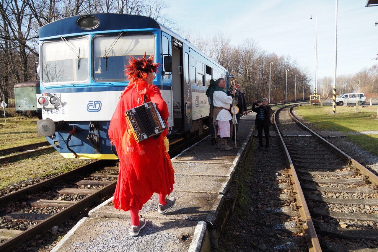 Cesta Zlatými Horami vyvrcholila na nádraží, kde se Jirka Pěčonka s mnoha dalšími postarali o úžasné masopustní občerstvení a veselou pohodu. Díky jemu i všem, kteří svým přispěním podpořili tuto tradiční akci!