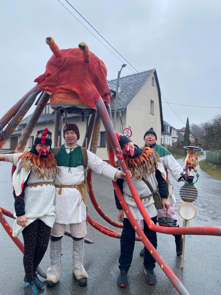 V sobotu 1. března náš klub opět pořádal tradiční masopustní průvod. Jako obvykle se jádro sešlo před kostelem, kde byla připravena obrovská rudá důlní chobotnice – symbol všeho zla – na vynesení z obce ven. Samozřejmě nechyběl dobře naladěný medvěd, basa na vozíčku, pojízdná udírna a řada dalších atrakcí. O zdejších masopustních tradicích se dočtete v článku Masopustní zvyky a písně Zlatohorska, v němž si také můžete poslechnout nejběžnější masopustní písničky.