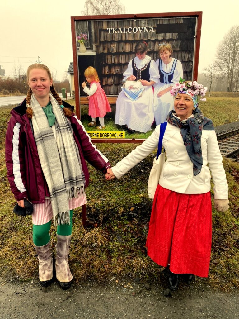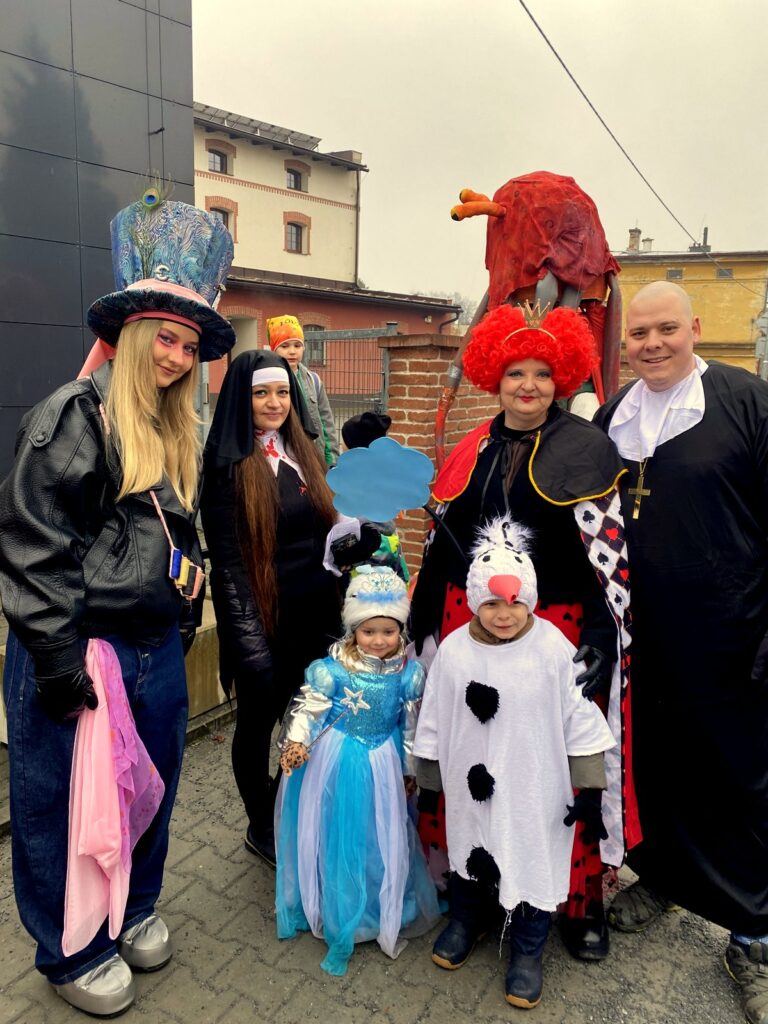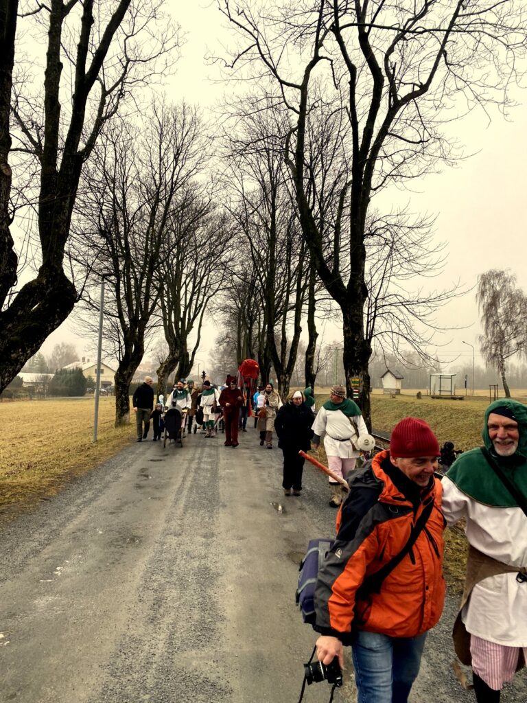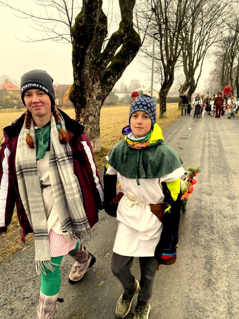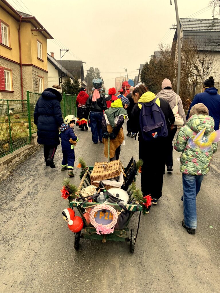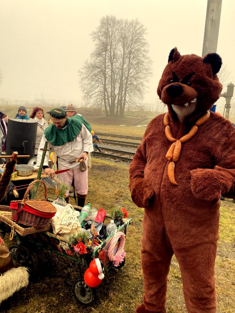 V sobotu 14. února jsme za zpěvů tradičních masopustních holaryjek vyrazili s medvědem a rudou chobotnicí na průvod od kostela ve Zlatých Horách na nádraží, kde jsme letošní masopustní veselici završili. Tradičně nechyběla pojízdná udírna a hojnost nápojů. Kdekdo přinesl něco na zub, takže přes chladné počasí jsme táhli zvesela. Účastníci dostali zpěvníčky masopustních písniček a na každém zastavení si mohla děvčata, paní i babičky zajistit na rok štěstí, zdraví díky tanci s medvědem.