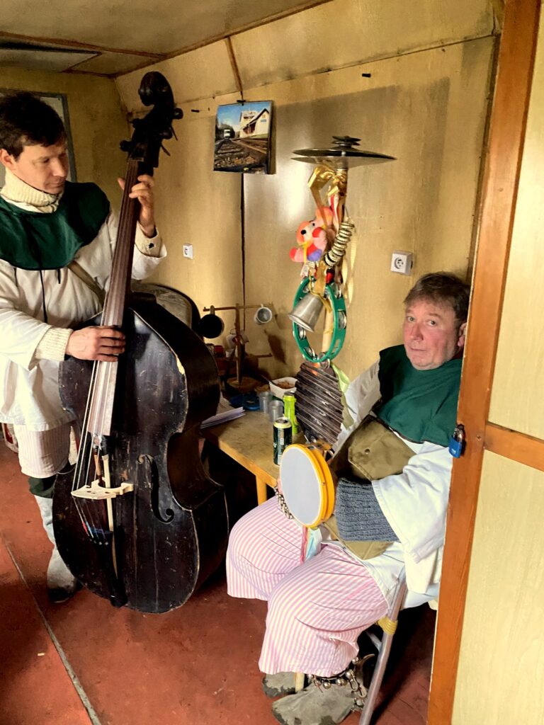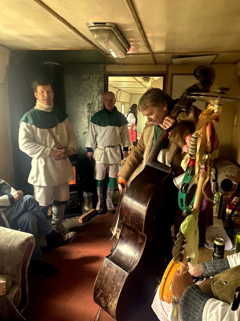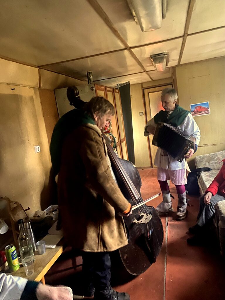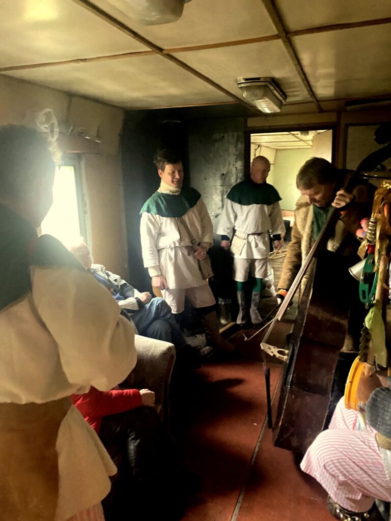 Závěr masopustního průvodu probíhal ve vagónu, kde jsme se loučili s basou dříve, než byla pochována.