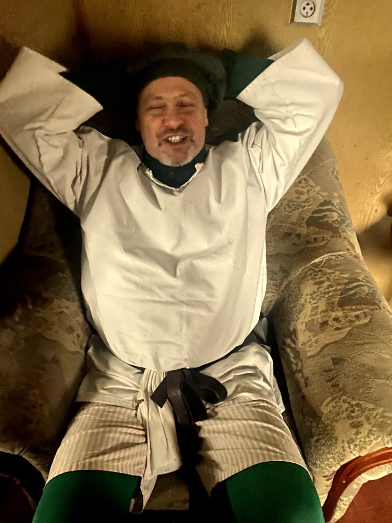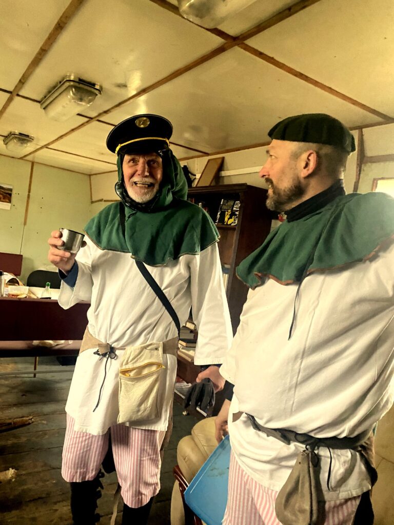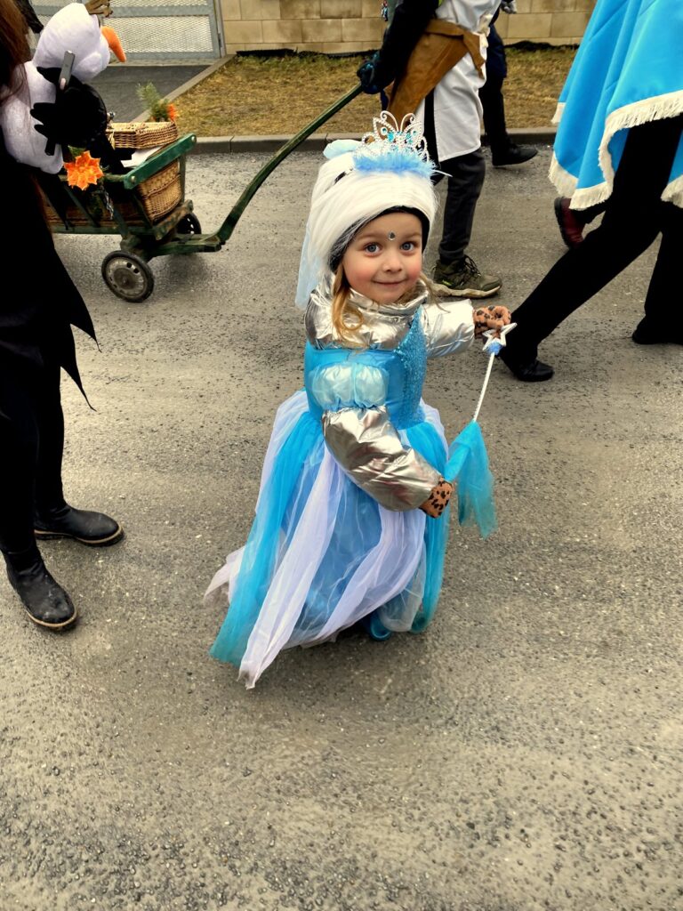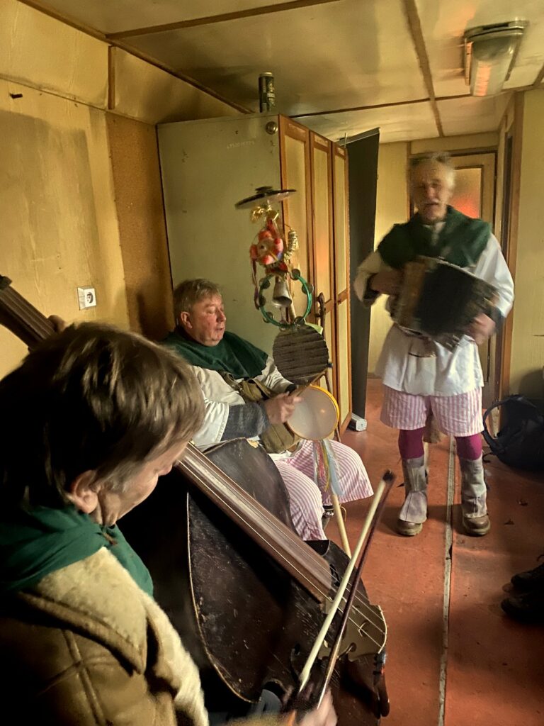 Závěr masopustního průvodu probíhal ve vagónu, kde jsme se loučili s basou dříve, než byla pochována.