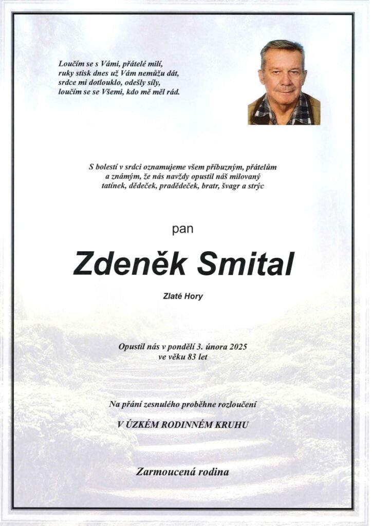 V pondělí 3. února 2025 nás zastihla smutná zpráva, že z našeho středu odešel náš zakládající člen a první předseda Klubu přátel Zlatých Hor, pan Zdeněk Smital. Zdeňkovi právem patřil členský průkaz s číslem 001. Bravurně vedl náš klub v dobách těžkých i v dobách největší slávy. Jeden z prvních závodních sáňkařů v Jeseníkách, výborný znalec lesa, sběratel a milovník historie. Mnoho pohlednic a starých fotografií, které nalézáte na nejrůznějších webech, pocházejí původně ze sbírek Zdeňka Smitala.