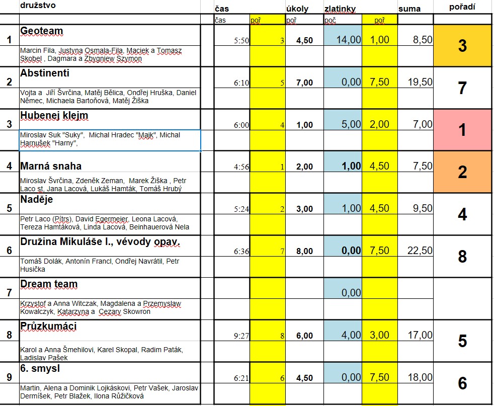 Start byl v 10 hod. před radnicí zahájen klasicky se zmrzlými kostkami písku se zlatem a jeho rýžováním – šlichováním. Poté všech 9 družstev letošního ročníku vyrazilo na náročnou trať, která si s mnohým nezadala s pověstným Chilkootským průsmykem. Přechod zasněžené Příčné hory pomocí rébusů nebyl žádnou procházkou růžovou zahradou. Ač se zastavení při přípravě tradičních zlatokopeckých fazolí mohlo jevit, coby báječná občerstvovací stanice, pro řadu účastníků by bylo zapotřebí takových soutěžních stanovišť více. Předpokládali jsme, že poslední družstvo dorazí do cíle – na ondřejovickou Doubravu kolem páté odpolední hodiny. Skutečnost: První družstvo dorazilo před pátou hodinou na poslední kontrolu, která byla vzdálena cca 2 km od cíle.